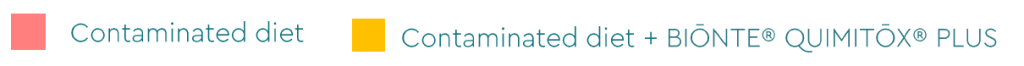 The experimental design consisted of two experimental groups: a group exposed to a contaminated diet that presented critical levels of aflatoxins and high levels of fumonisins, and a second group exposed to this contaminated diet in addition to a dose of 1,5 kg/ton of BIŌNTE® QUIMITŌX® PLUS.
