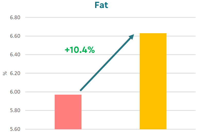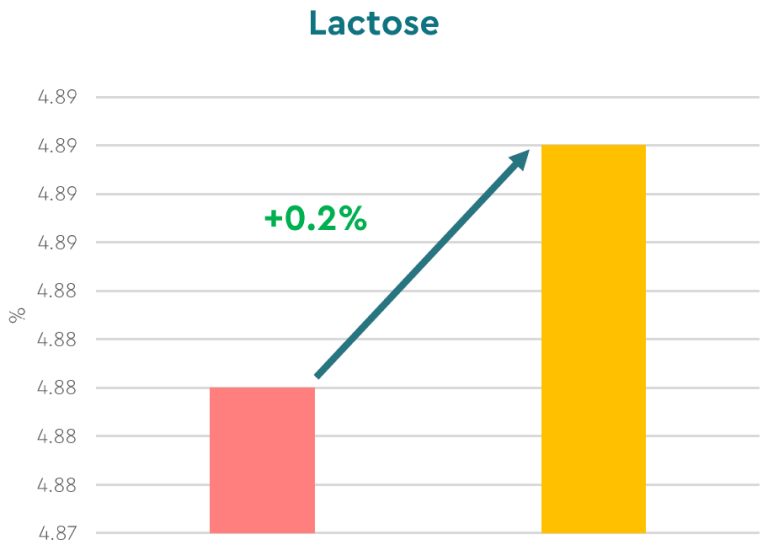Various parameters related to milk quality were also controlled. An improvement in these was observed with a 10.4% increase in fat content, 3% in total solids, 1.5% in protein, and 0.2% in lactose (Figure 6). This improvement raises the quality and nutritional value of the milk, which is crucial both for the profitability of dairy production and for guaranteeing optimal nutrition for the lambs.