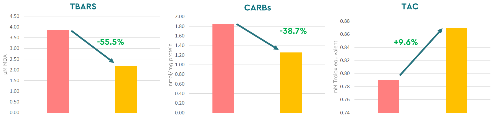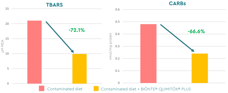 Additionally, the positive effect of BIŌNTE® QUIMITŌX® PLUS was evaluated by controlling oxidative stress biomarkers in milk. A marked mitigation of oxidative stress was observed, with a 72.1% decrease in TBARS levels and a 66.6% reduction in CARBs levels (Figure 7).