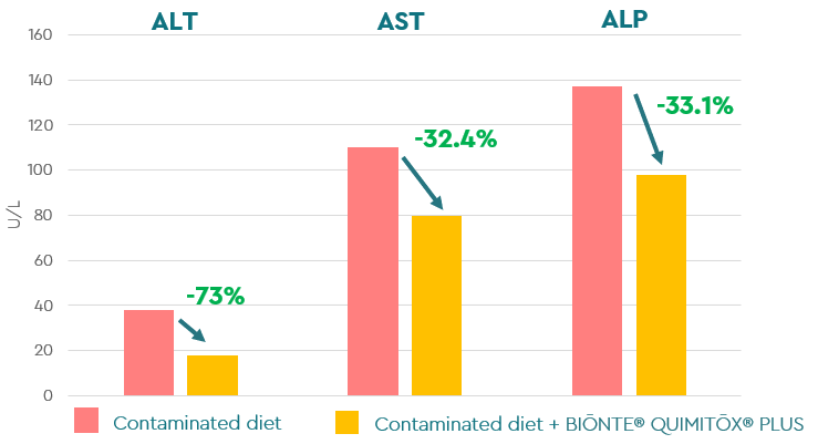 Finally, when evaluating the effect of BIŌNTE® QUIMITŌX® PLUS on the biomarkers of liver function in plasma, results were obtained that indicate its hepatoprotective effects, key during the lactation period. A 73% decrease was recorded in ALT levels, 32% in AST, and 33% in ALP (Figure 9).