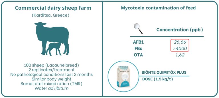 In this context, BIŌNTE® QUIMITŌX® PLUS offers a complete solution, basing its action on three main modes: adsorption, bioprotection, and post-biotic effect. This compound has demonstrated high efficacy against multiple mycotoxins, consistently providing hepatoprotective and antioxidant properties during lactation. With the objective of validating its efficacy against the subclinical effects of mycotoxins in a real productive environment in sheep production, a field study was carried out in Greece, in collaboration with the University of Thessaly, under commercial farming conditions.