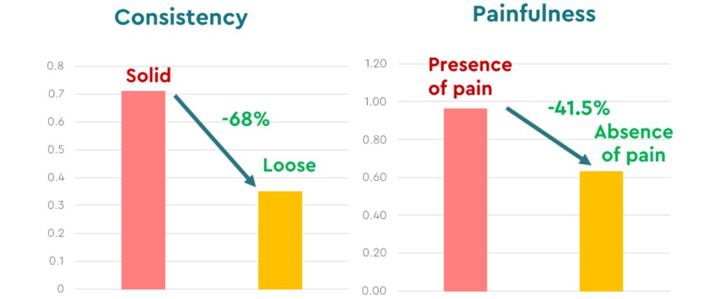 Regarding udder characteristics, the animals that received the diet supplemented with BIŌNTE® QUIMITŌX® PLUS demonstrated a significant improvement (Figure 4). A 90.1% reduction in the score for udder formation/regression was observed, a 67.7% decrease in redness, and consistency was improved by 68%, resulting in laxer (or elastic) udders. These results indicate a healthier and more functional udder, with less susceptibility to inflammation and mastitis, which optimizes animal welfare. Furthermore, a 41.5% reduction in pain (sensitivity) was recorded. The measurement of these parameters was by means of a scale of 0 to 1, where 0 indicated the absence of the sign and 1 its presence.