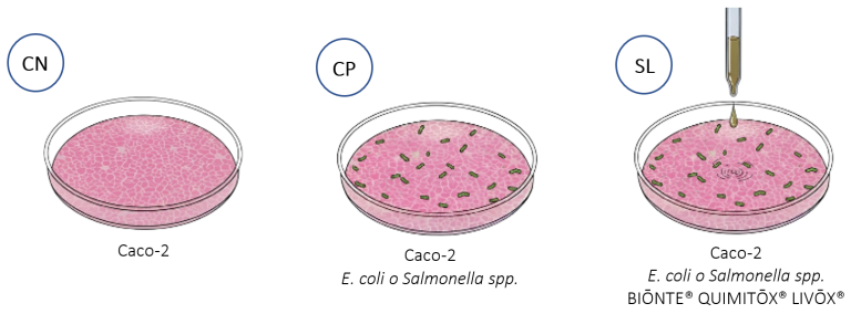 - Grupo BIŌNTE® QUIMITŌX® LIVŌX® (SL): cultivo de células Caco-2 inoculado con 102 UFC/mL de coli o Salmonella spp. (factor estresante), al que se incorporaron diferentes concentraciones de BIŌNTE® QUIMITŌX® LIVŌX® (0-100%).