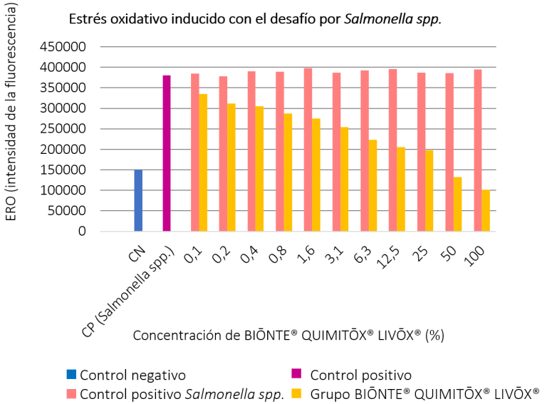 Figura 3. Resultados de la evaluación del estrés oxidativo inducido por Salmonella spp a diferentes concentraciones (%) BIŌNTE® QUIMITŌX® LIVŌX®.