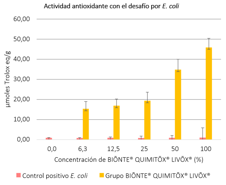 Figura 4. Resultados de la actividad antioxidante a diferentes concentraciones (%) de BIŌNTE® QUIMITŌX® LIVŌX® en células expuestas a E. coli.