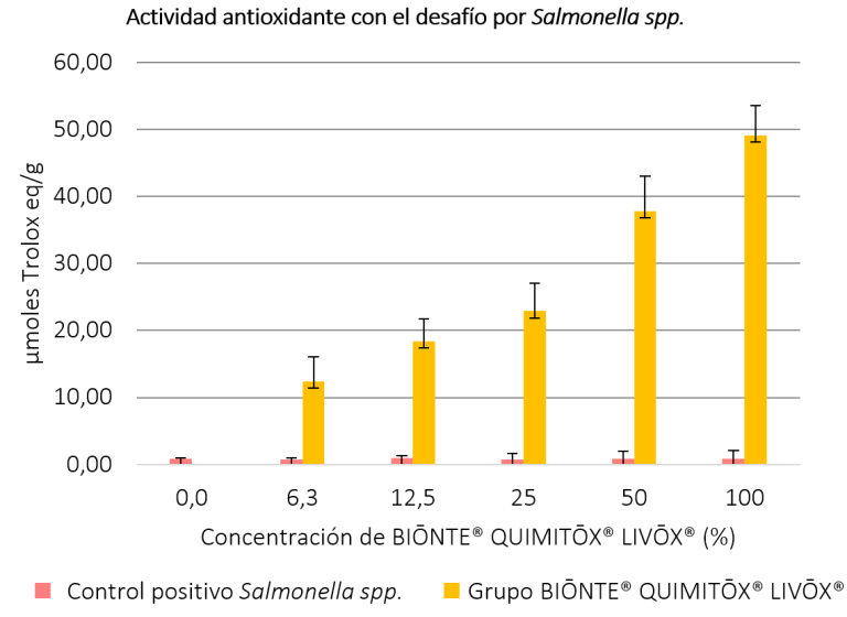 Figura 5. Resultados de la actividad antioxidante a diferentes concentraciones (%) de BIŌNTE® QUIMITŌX® LIVŌX® en células expuestas a Salmonella spp.