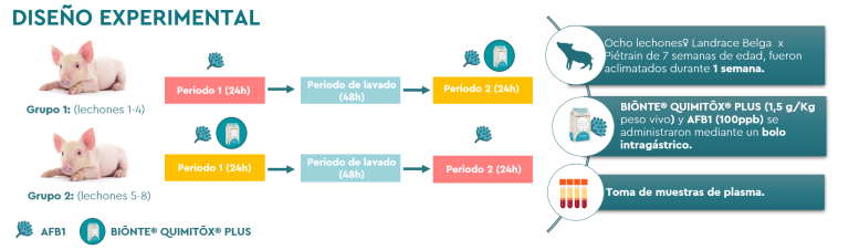 El grupo 1 recibió durante el primer periodo un bolo intragástrico de AFB1 (100 ppb), a continuación, experimentó un periodo de lavado de 48 horas, y finalmente, durante el periodo 2, recibió otro bolo de AFB1 (100 ppb) acompañado del producto BIŌNTE® QUIMITŌX® PLUS®, a una dosis de 1,5 g/kg de peso vivo. Por otro lado, el grupo 2 recibió durante el primer periodo un bolo de AFB1 (100 ppb) junto con el producto BIŌNTE® QUIMITŌX® PLUS® a la misma dosis, seguidamente tuvo lugar la fase de lavado, y en el periodo 2 recibió de nuevo un bolo de AFB1 (100 ppb).