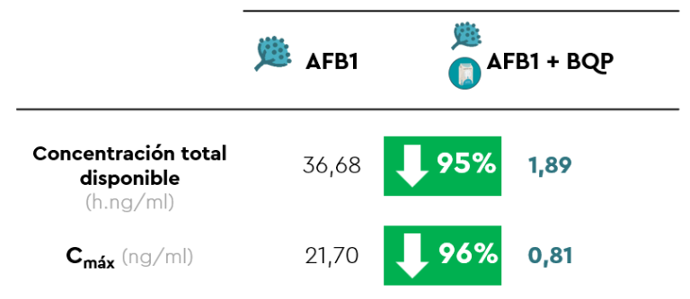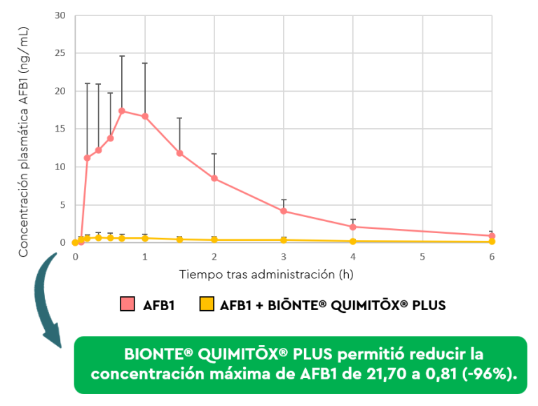 El efecto de BIŌNTE® QUIMITŌX® PLUS sobre la absorción oral de AFB1 se evaluó comparando los parámetros toxicocinéticos basados en las concentraciones plasmáticas de AFB1 en muestras tratadas exclusivamente con AFB1, frente a las que presentaban aquellos animales expuestos a AFB1 junto con el producto anti-micotoxinas.