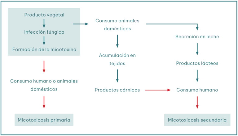 Existen diferentes vías de exposición, se conoce que cuando estas toxinas son ingeridas directamente por el consumidor dan lugar a una micotoxicosis primaria. Mientras que en otros casos, el consumidor puede padecer esta intoxicación debido al consumo de productos de origen animal contaminados (ej. carne, leche o huevos), lo que se denomina micotoxicosis secundaria (Figura 1).