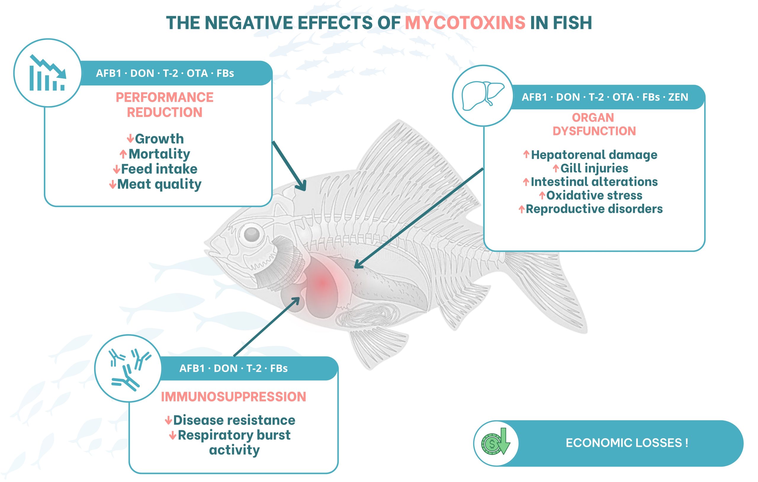 Mycotoxin contamination negatively affects the health of fish, reducing overall productivity. AFB1 and ochratoxin residues in aquatic species may represent risks to human health.
