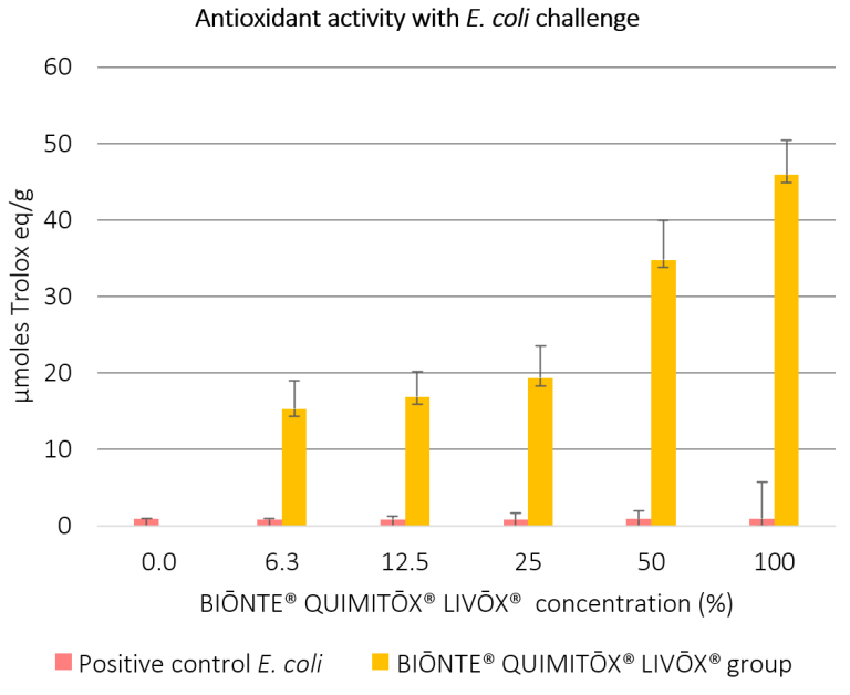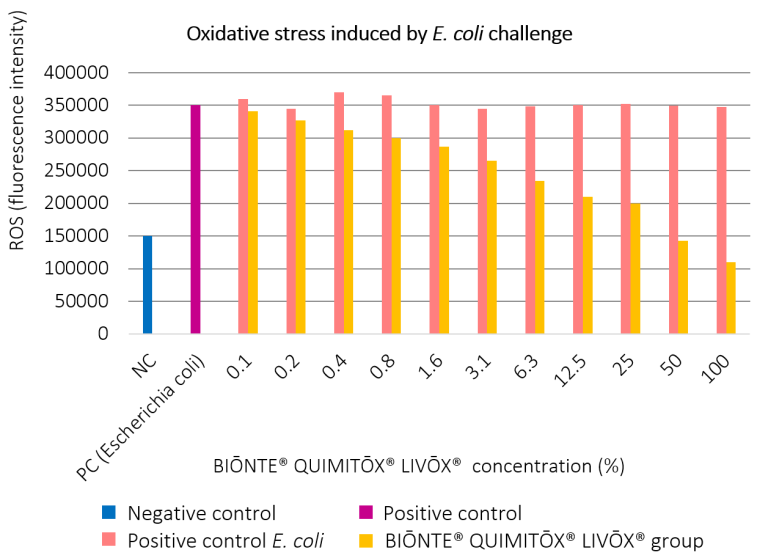 Figure 2. Results of the evaluation of oxidative stress induced by E. coli at different concentrations (%) of BIŌNTE® QUIMITŌX® LIVŌX®.