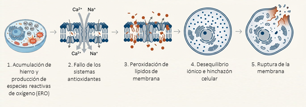 La ferroptosis comienza con una alteración en la homeostasis del hierro, lo que provoca un aumento del hierro ferroso (Fe2+) libre en el citoplasma (Dixon et al., 2024; Zhu et al., 2025). Este exceso de hierro libre desencadena la denominada reacción de Fenton, la cual genera una acumulación masiva de especies reactivas de oxígeno (ERO) que atacan las estructuras de la célula (Guan et al., 2025; Wang et al., 2024; Zhu et al., 2025).
