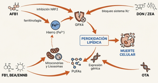 La activación de la ferroptosis por parte de las micotoxinas responde a una ofensiva coordinada a través de tres vías interconectadas: la disrupción del metabolismo del hierro, el agotamiento del sistema antioxidante GPX4 y la acumulación masiva de peróxidos lipídicos (Zhu et al., 2025). Toxinas como la aflatoxina B1 (AFB1), el deoxinivalenol (DON) y la zearalenona (ZEA) actúan como catalizadores de este proceso, generando niveles de ERO que sobrepasan las defensas naturales de la célula (Ding et al., 2023; Zhu et al., 2025).
