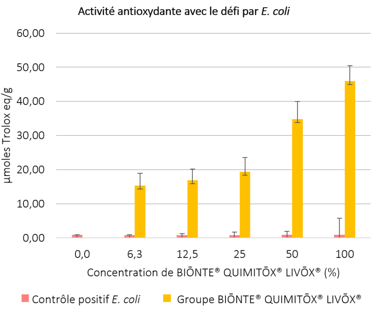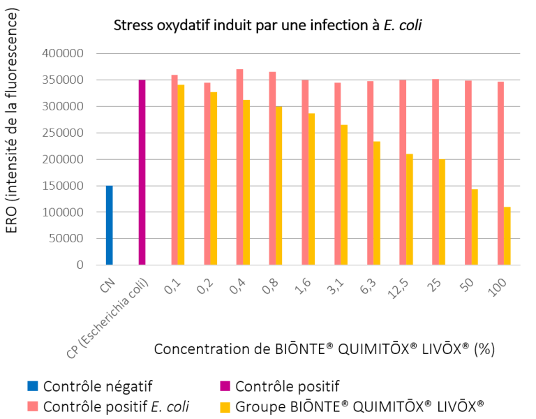 Figure 2. Résultats de l’évaluation du stress oxydatif induit par E. coli à différentes concentrations (%) BIŌNTE® QUIMITŌX® LIVŌX®.