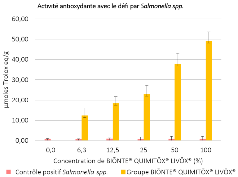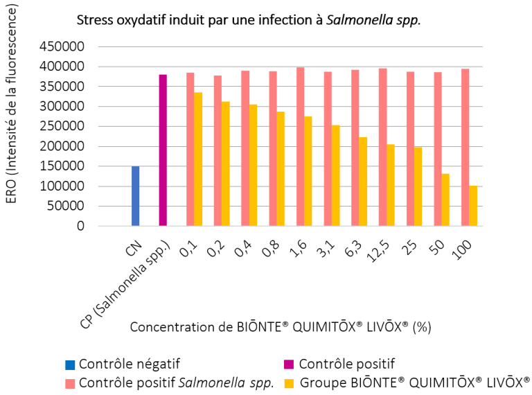 Figure 3. Résultats de l’évaluation du stress oxydatif induit par Salmonella spp à différentes concentrations (%) BIŌNTE® QUIMITŌX® LIVŌX®.