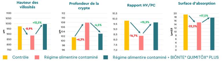 l’administration de BIŌNTE® QUIMITŌX® PLUS, a permis de contrer les dommages intestinaux causés aux animaux par l’exposition aux aflatoxines. Par conséquent, la surface d’absorption intestinale a augmenté de 17,5 %.