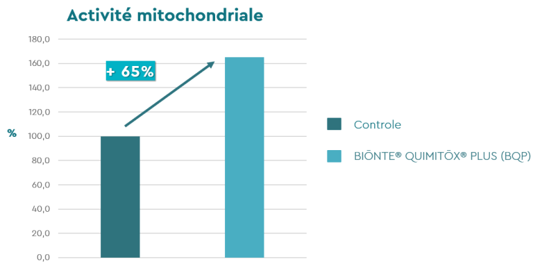 Les résultats ont montré une augmentation de 65 % de l’activité mitochondriale dans les cellules du tissu expérimental grâce à l’administration du produit (figure 2). Il est ainsi démontré que BIŌNTE® QUIMITŌX® PLUS augmente la viabilité des cellules, améliorant ainsi la santé générale de l’épithélium intestinal.