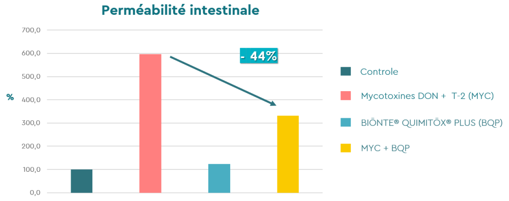 À partir de la présente étude ex vivo, la perméabilité intestinale a été évaluée dans le but d’évaluer à la fois l’effet toxique des mycotoxines sur l’épithélium intestinal et la capacité de BIŌNTE® QUIMITŌX® PLUS à contrer cette toxicité.