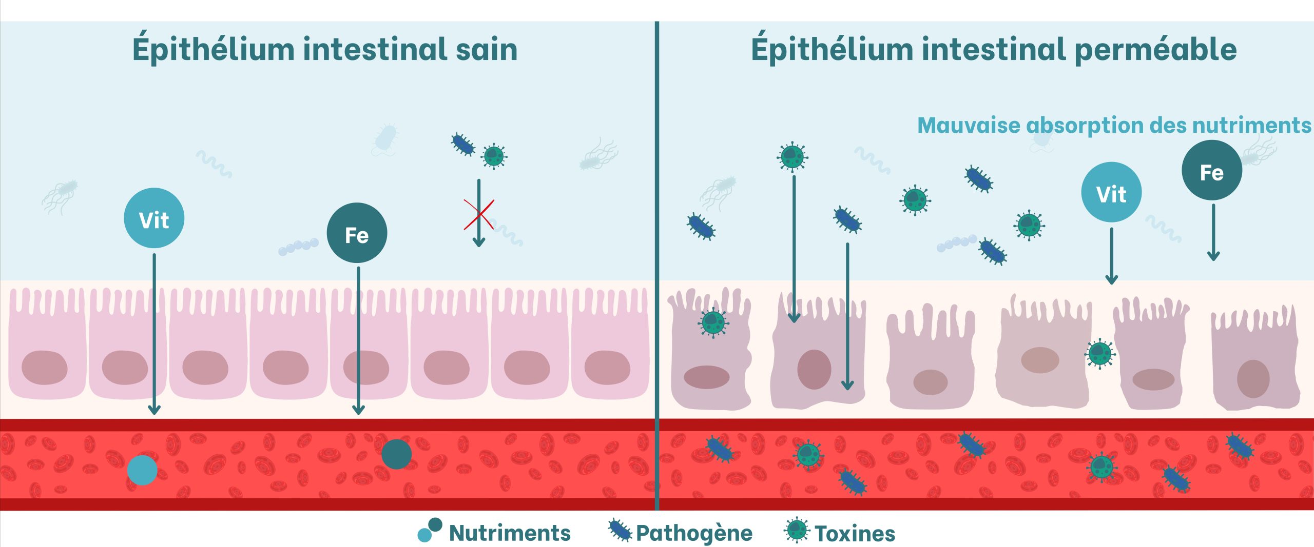 Figure 3. Schéma de la perméabilité intestinale face aux toxines et aux agents pathogènes. À gauche, épithélium sain imperméable; à droite, épithélium altéré perméable aux toxines et aux agents pathogènes.