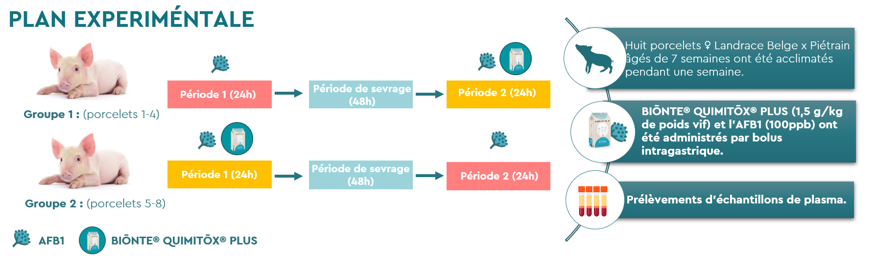 Le groupe 1 a reçu, au cours de la première période, un bolus intragastrique d’AFB1 (100 ppb), suivi d’une période de sevrage (wash-out) de 48 heures, puis, lors de la période 2, un autre bolus d’AFB1 (100 ppb) accompagné du produit BIŌNTE® QUIMITŌX® PLUS® à une dose de 1,5 g/kg de poids vif. De son côté, le groupe 2 a reçu, durant la première période, un bolus d’AFB1 (100 ppb) associé au produit BIŌNTE® QUIMITŌX® PLUS® à la même dose, suivi de la phase de sevrage, pour recevoir à nouveau, lors de la période 2, un bolus d’AFB1 (100 ppb).