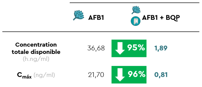 L’effet de BIŌNTE® QUIMITŌX® PLUS sur l’absorption orale de l’AFB1 a été évalué en comparant les paramètres toxicocinétiques basés sur les concentrations plasmatiques d’AFB1 dans les échantillons traités exclusivement à l’AFB1, par rapport à ceux des animaux exposés à l’AFB1 conjointement avec le produit anti-mycotoxines.