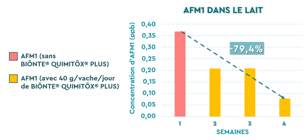 L’ajout de BIŌNTE® QUIMITOX® PLUS à l’alimentation des animaux a permis d’observer une réduction drastique et durable de la toxine dans le produit final. Au cours de la première semaine de contrôle initial, la concentration d’AFM1 dans le lait s’élevait à environ 0,37 ppb. Après le début de la supplémentation, une baisse significative a été observée au cours des deuxième et troisième semaines, atteignant son point de remise maximale à la quatrième semaine avec des niveaux d’environ 0,08 ppb. À l’issue de l’étude, BIŌNTE® QUIMITOX® PLUS a démontré sa grande capacité d’adsorption et de bioprotection en obtenant une réduction totale de 79,4 % de la concentration d’AFM1 dans le lait par rapport aux valeurs initiales.