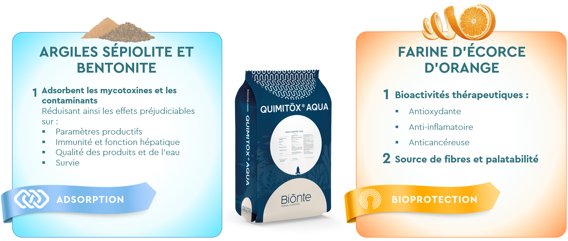 BIŌNTE® QUIMITŌX® AQUA est un produit anti-mycotoxines formulé comme un adsorbant spécialisé pour les espèces aquatiques. Outre son efficace capacité d’adsorption, il intègre une stratégie de bioprotection contre les mycotoxines, grâce à l’ajout de farine d’écorce d’orange dans sa formule.
