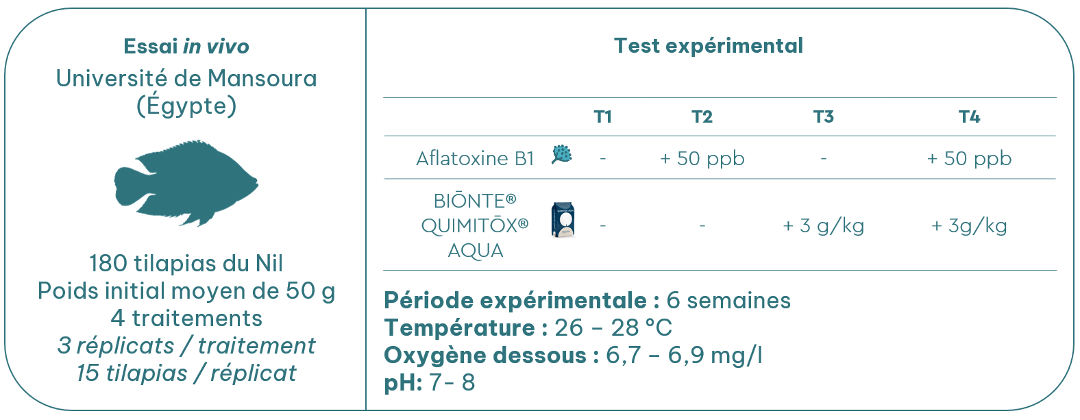 Afin d’évaluer l’efficacité de BIŌNTE® QUIMITŌX® AQUA chez le tilapia du Nil, l’étude in vivo décrite ci-dessous a été menée en collaboration avec l’Université de Mansoura (Égypte).