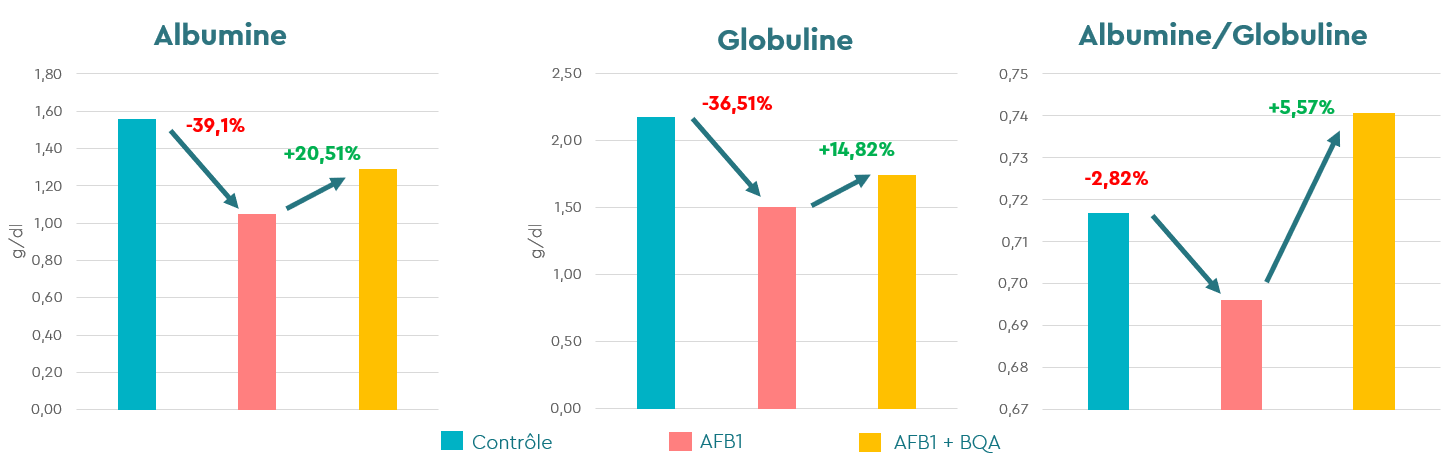 La supplémentation en BIŌNTE® QUIMITŌX® AQUA a efficacement contré ces effets, ramenant les principaux paramètres hématologiques à des valeurs similaires à celles du groupe témoin. Ces résultats confirment le rôle protecteur du produit face aux lésions hématologiques induites par l’aflatoxine B1.