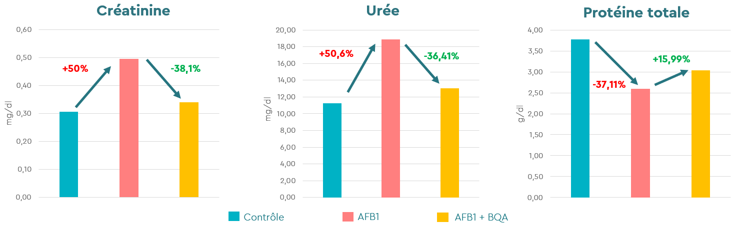L’ajout de BIŌNTE® QUIMITŌX® AQUA (3 g/kg) dans le régime alimentaire contaminé a permis d’améliorer significativement ces paramètres biochimiques, en normalisant les taux d’urée et de créatinine et en favorisant la récupération du métabolisme protéique. En conséquence, les poissons ayant reçu ce supplément ont montré une récupération du poids final, du gain de poids et du taux de croissance spécifique, atteignant des valeurs comparables à celles du groupe témoin.