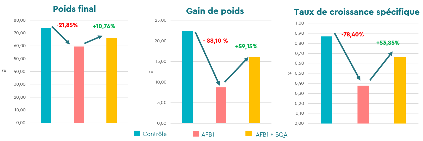 Les aflatoxines ont un impact négatif tant sur le rendement productif que sur la santé des espèces aquacoles, entraînant une diminution du gain de poids et de la survie. Chez le tilapia du Nil (Oreochromis niloticus), il a été démontré qu‘elles altèrent la croissance, la fonction hépatique, l’état oxydatif, la qualité de la chair ainsi que les systèmes immunitaire et respiratoire, compromettant ainsi la survie des animaux (Deng et al., 2010).