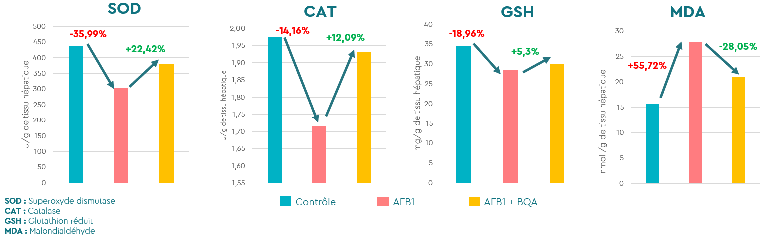 L’ajout de BIŌNTE® QUIMITŌX® AQUA a considérablement réduit les taux de MDA et amélioré l’activité des enzymes antioxydantes, rétablissant dans le foie un équilibre redox similaire à celui du groupe témoin. Cet effet démontre la capacité du produit à atténuer les dommages oxydatifs associés à l’exposition aux mycotoxines.