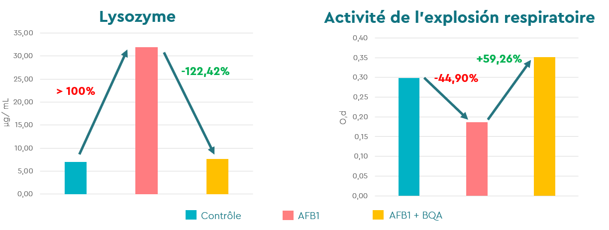 L’administration de BIŌNTE® QUIMITŌX® AQUA a permis de normaliser ces paramètres immunologiques, rétablissant ainsi le bon fonctionnement du système immunitaire inné. Cet effet immunomodulateur contribue à améliorer la résistance des animaux face aux situations de stress et aux problèmes sanitaires liés à la contamination par les mycotoxines.