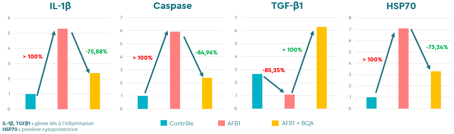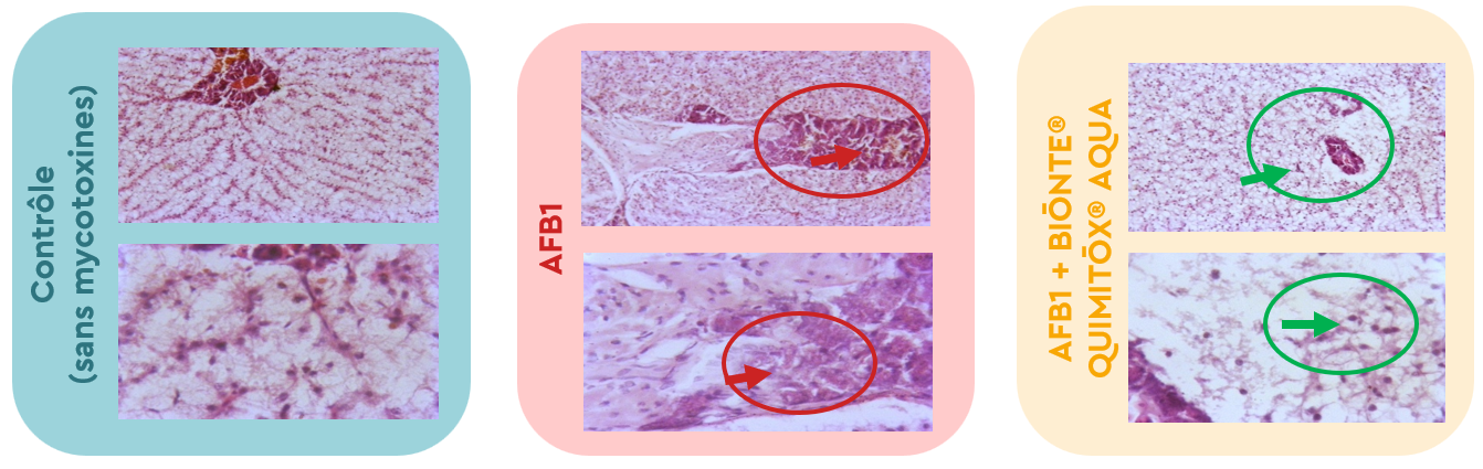 Parmi les lésions causées au foie par l’AFB1, on note notamment des hémorragies, des hépatocytes nécrotiques et une fibrose. Ces signes cliniques étaient absents dans le groupe ayant reçu la mycotoxine et le produit.
