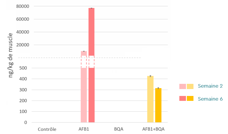 La bioaccumulation d’aflatoxine B1 dans le muscle représente l’un des principaux risques associés à la contamination alimentaire, tant pour la santé animale que pour la sécurité alimentaire. Dans le groupe exposé uniquement à l’AFB1, des concentrations musculaires de 10 269 ng/kg ont été détectées à 2 semaines et de 77 308 ng/kg à 6 semaines.
