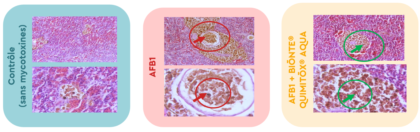En ce qui concerne la rate, la principale lésion observée était une inflammation granulomateuse, qui s’est avérée réduite dans le groupe ayant reçu à la fois la mycotoxine et la dose de BIŌNTE® QUIMITŌX® AQUA.