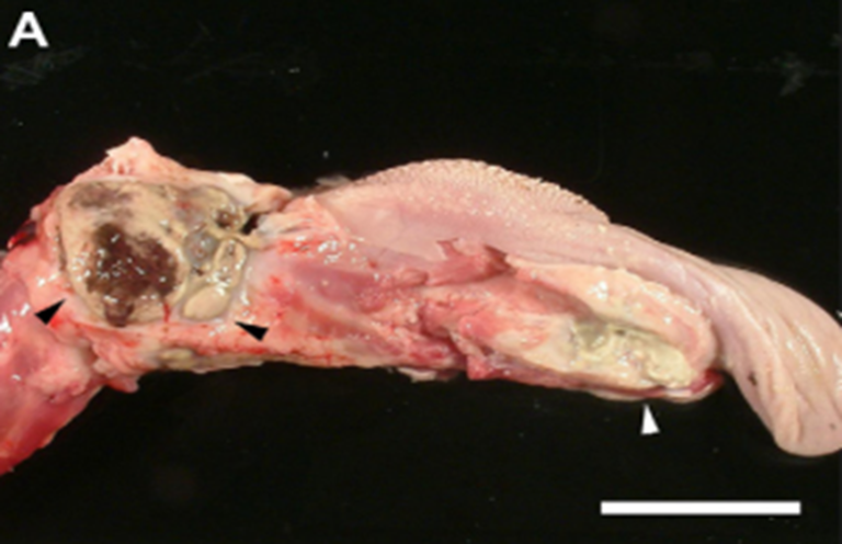 Imagen 16. Estomatitis multifocal necrosante y purulenta (faringe y lengua).