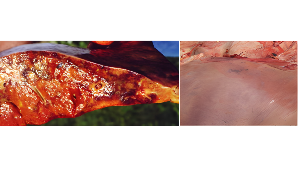 Las aflatoxinas representan un riesgo elevado en rumiantes, especialmente en vacas lecheras, debido a su demostrada transferencia a la leche que se destina a consumo humano o a la alimentación de terneros (Hernández-Valdivia et al., 2021). La aflatoxina B1 (AFB1) es la más conocida dentro de esta familia y sus efectos patológicos son severos, destacando en la necropsia: la fibrosis hepática con proliferación de células de los conductos biliares, megalocitosis y estasis biliar (Imagen 1). Además, la exposición a esta micotoxina puede dar lugar a hepatomegalia (Imagen 2) o un hígado hemorrágico y con textura bronceada pálida, así como hígado y corazón congestivos y riñones hemorrágicos (Imagen 3 e Imagen 4) (Sajid Umar et al., 2015; Ismail et al., 2020; Álvarez-Días et al., 2022). En presentaciones subagudas o crónicas, se pueden observar hematomas subcutáneos y subserosos y enteritis hemorrágicas con evidentes ictericias.