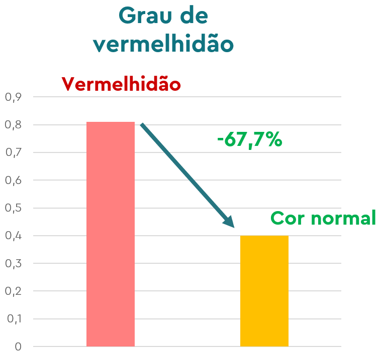 Em relação às características da glândula mamária, os animais que receberam a dieta suplementada com BIŌNTE® QUIMITŌX® PLUS demonstraram uma melhora significativa (Figura 4). Observou-se uma redução da pontuação na formação/regressão do úbere em 90,1%, uma diminuição da vermelhidão de 67,7%, e a consistência melhorou em 68%, o que resulta em úberes mais laxos (ou elásticos). Estes resultados indicam um úbere mais saudável e funcional, com menor suscetibilidade à inflamação e à mastite, o que otimiza o bem-estar animal. Além disso, registrou-se uma redução da dor (sensibilidade) de 41,5%. A medição destes parâmetros foi feita mediante uma escala de 0 a 1, onde 0 indicava a ausência do sinal e 1 a sua presença.