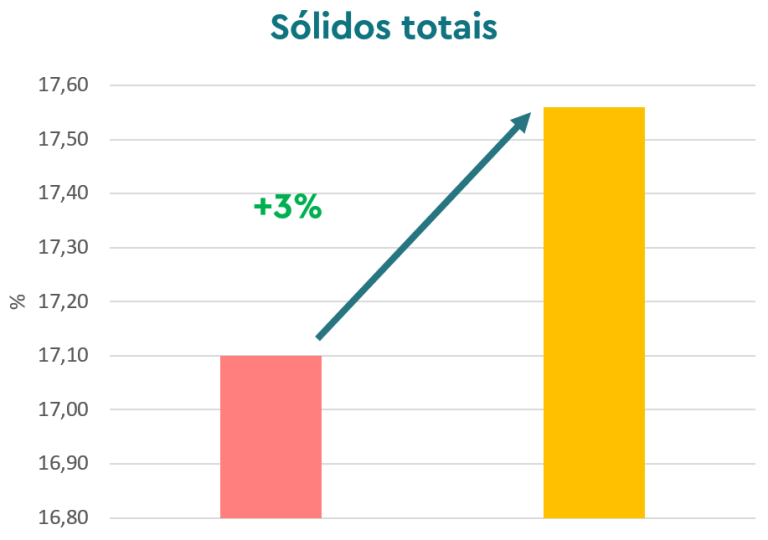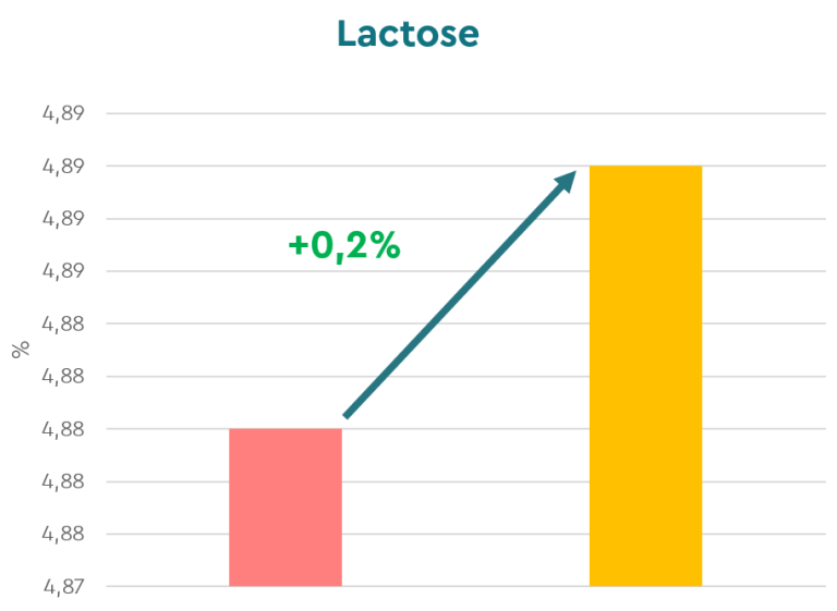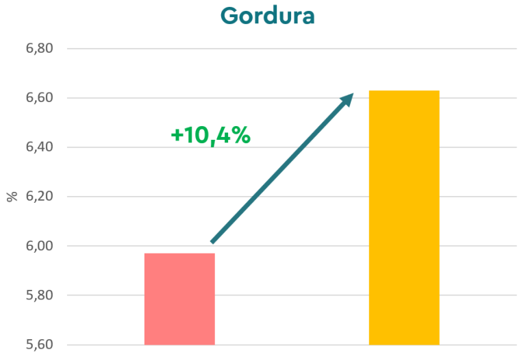 Também foram monitorados diversos parâmetros relacionados com a qualidade do leite. Observou-se uma melhora dos mesmos com um aumento de 10,4% no conteúdo de gordura, de 3% em sólidos totais, de 1,5% em proteína e de 0,2% em lactose (Figura 6). Esta melhora eleva a qualidade e o valor nutricional do leite, o que é crucial tanto para a rentabilidade da produção láctea como para garantir uma nutrição ótima dos cordeiros.