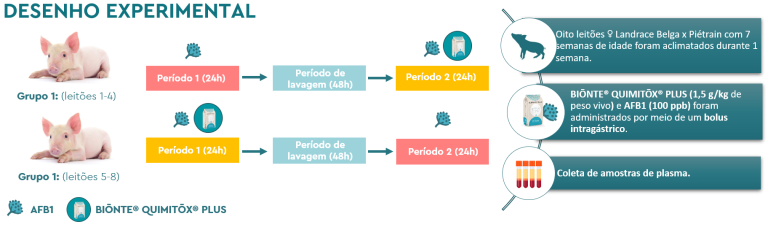 O grupo 1 recebeu durante o primeiro período um bolo intragástrico de AFB1 (100 ppb), seguindo-se um período de lavagem de 48 horas e, finalmente, durante o período 2, recebeu outro bolo de AFB1 (100 ppb) acompanhado do produto BIŌNTE® QUIMITŌX® PLUS®, numa dose de 1,5 g/kg de peso vivo. Por outro lado, o grupo 2 recebeu durante o primeiro período um bolo de AFB1 (100 ppb) juntamente com o produto BIŌNTE® QUIMITŌX® PLUS® à mesma dose, seguindo-se a fase de lavagem e, no período 2, recebeu novamente um bolo de AFB1 (100 ppb).