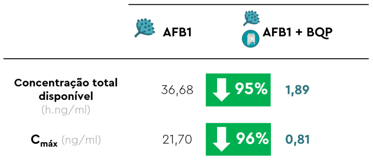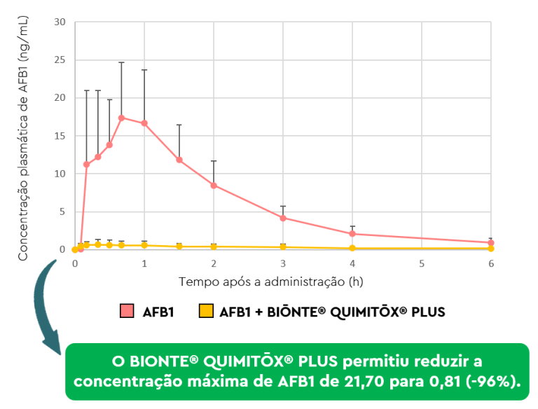 O efeito de BIŌNTE® QUIMITŌX® PLUS sobre a absorção oral de AFB1 foi avaliado comparando os parâmetros toxicocinéticos baseados nas concentrações plasmáticas de AFB1 em amostras tratadas exclusivamente com AFB1, face às que apresentavam aqueles animais expostos a AFB1 junto com o produto anti-micotoxinas.