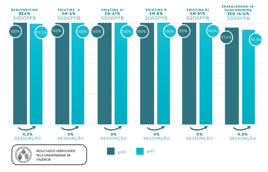 Recentemente, os resultados de um estudo in vitro demonstraram a eficácia deste produto contra micotoxinas emergentes e mascaradas. Cabe destacar que o produto também apresenta resultados positivos de eficácia na adsorção das micotoxinas mais prevalentes (Zearalenone, Fumonisin B1, Ocratoxina, micotoxina T2 e Aflatoxina FB1) validadas pelo Trilogy Lab (EUA).