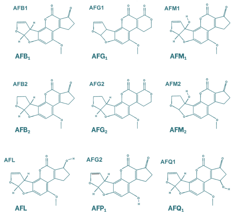 Aflatoxins are characterised by a chemical structure composed of four aromatic rings, resulting in a rigid and planar molecular conformation. The most relevant mycotoxins within this group are aflatoxins B1, B2, G1 and G2, as well as aflatoxin M1, the latter being a metabolite of aflatoxin B1. B and G aflatoxins differ in the structure of their six-membered lactone ring, while the distinction between the 1 and 2 forms is based on the oxidation of the double bond. In addition to these compounds, other aflatoxin metabolites have been identified, including aflatoxicol, which is formed through the reduction of the ketone group; aflatoxin P1 (AFP1), in which the ether group is converted into an alcohol; and aflatoxin Q1 (AFQ1), which contains an alcohol group in the cyclopentanone moiety.