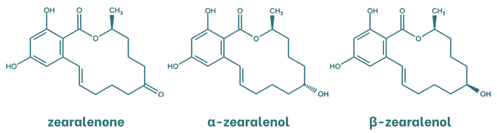 Zearalenone (ZEN) is a mycotoxin with oestrogenic activity and a resorcylic acid lactone structure. The main metabolites of zearalenone are α- and β-zearalenol, which are formed by the reduction of the ketone group to an alcohol. These metabolites are stereoisomers that differ in the chirality of the carbon atom to which the hydroxyl group is attached.