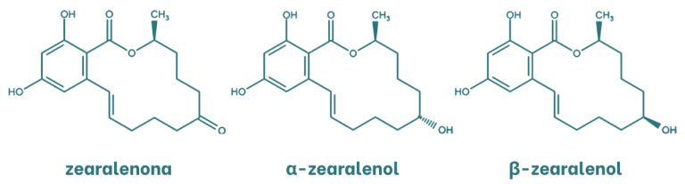 La zearalenona (ZEA) es una micotoxina de naturaleza estrogénica con una estructura lactona del ácido resorcicíclico. Los principales metabolitos de la zearalenona son el α y β-zearalenol que se generan por la oxidación del grupo cetona a alcohol. Estos metabolitos son isómeros que se diferencian por la quiralidad del carbono al cual se encuentra enlazado el grupo hidroxilo.