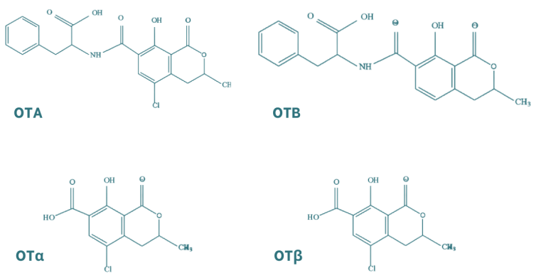 Las ocratoxinas están compuestas por la unión de un grupo fenilalanina con el ácido dihidroisocumárico mediante un enlace péptico, en el cual intervienen el grupo carboxilo (-COOH) y el grupo amino (-NH2). Existen principalmente dos tipos de ocratoxinas, A y B, las cuales se distinguen por la presencia de un grupo cloruro en la forma A.  Las ocratoxinas se pueden hidrolizar obteniendo los metabolitos OTα y OTβ, que presentan menor toxicidad.