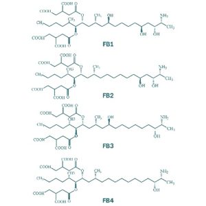 Las fumonisinas presentan una estructura molecular similar a la de una cadena lipídica. Existen cuatro tipos de fumonisinas, diferenciadas entre ellas por la presencia de grupos alcohol en las posiciones 5 y 10 de la cadena. Dentro de este grupo la fumonisina B1 (FB1) es la que genera una mayor toxicidad. Además, este tipo de micotoxinas presentan ramificaciones mediante ésteres en los carbonos de posición 14 y 15.